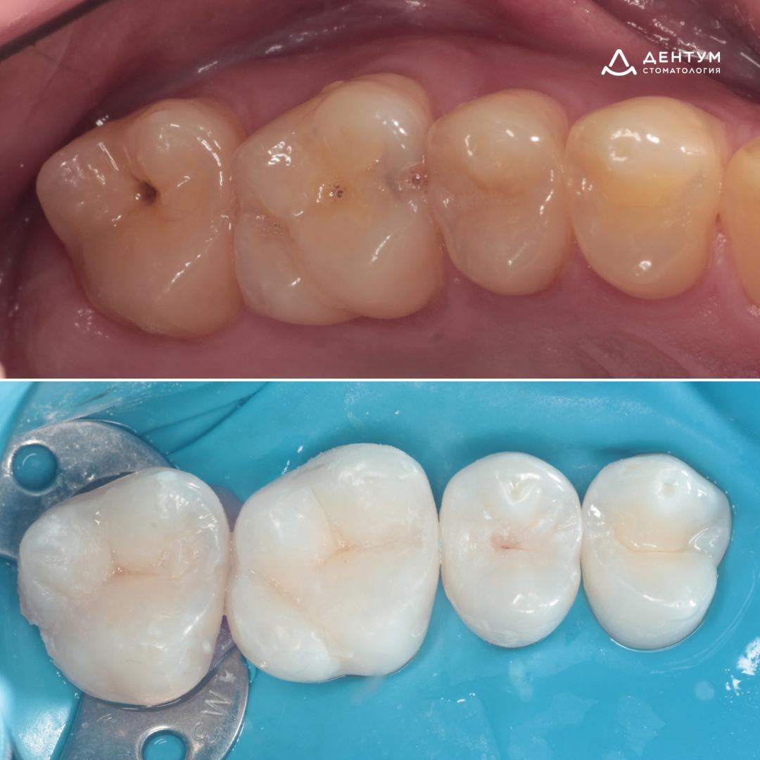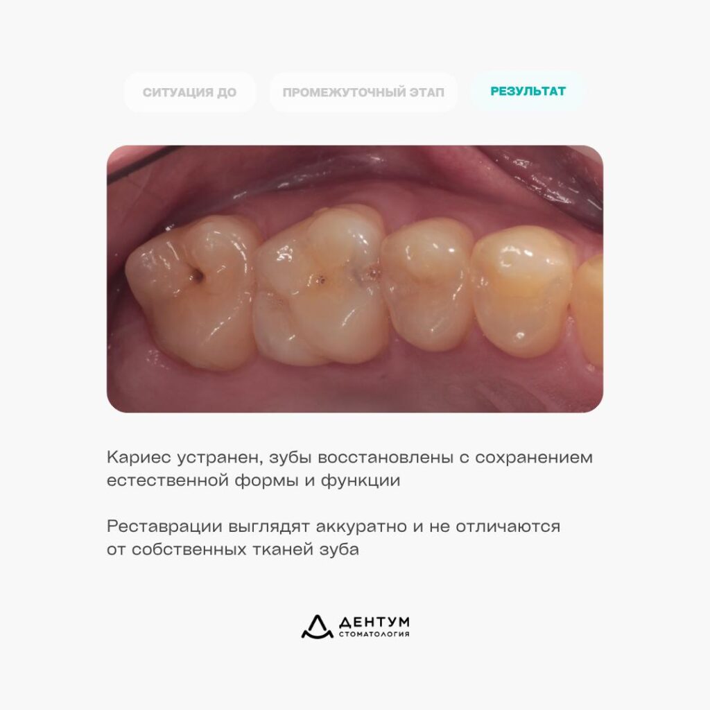 Кариес устранен, зубы выглядят естественно, полностью сохранена жевательная функция и комфорт.