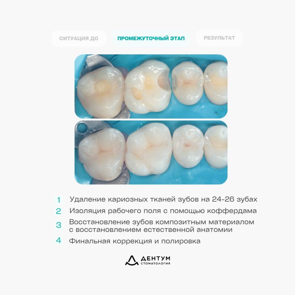 Особое внимание уделено зоне между 24 и 25 зубом — восстановлен плотный контакт, чтобы предотвратить застревание пищи и повторное развитие кариеса. - Проведена изоляция с помощью коффердама для защиты от влаги и повышения качества лечения.