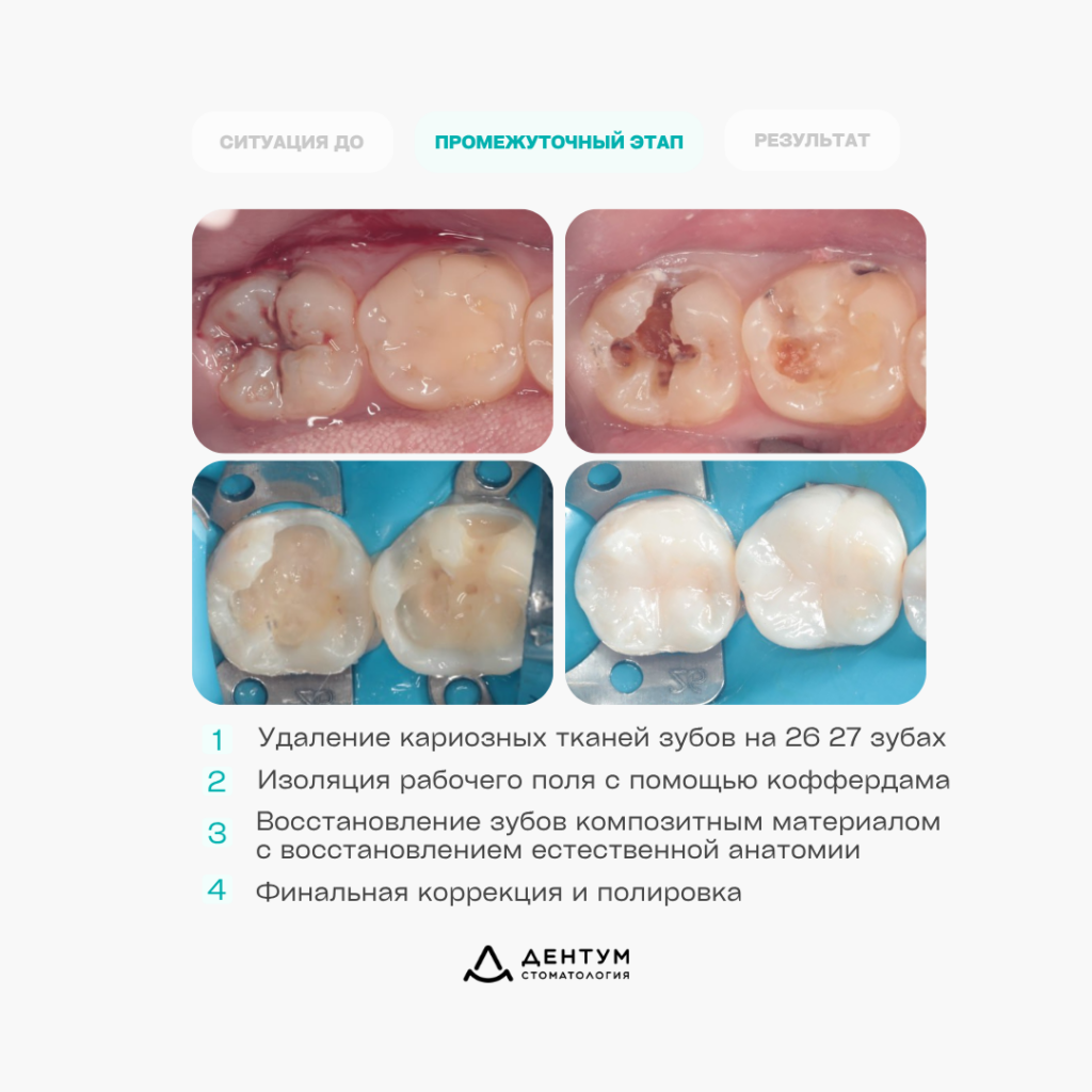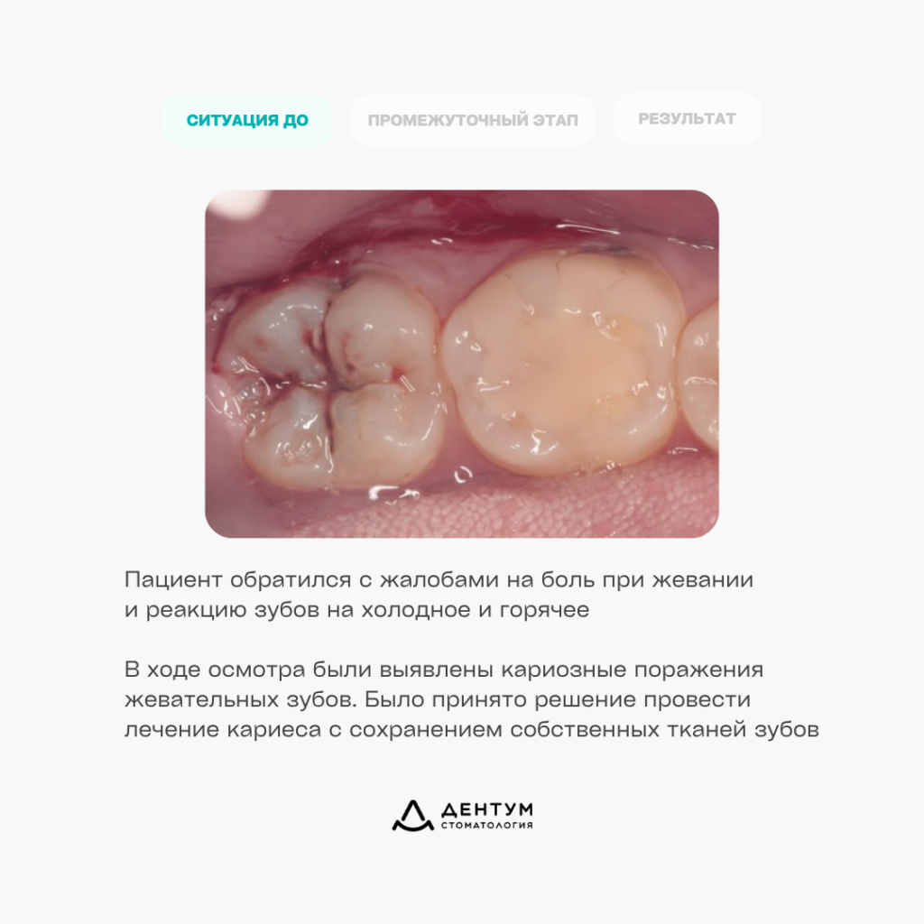 В ходе клинического осмотра были выявлены кариозные поражения жевательных зубов. После диагностики было принято решение провести лечение с сохранением максимально возможного объема собственных тканей зубов.