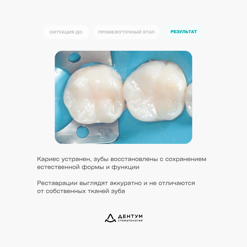 Кариозные поражения полностью устранены, зубы восстановлены с сохранением их анатомической формы и функции.