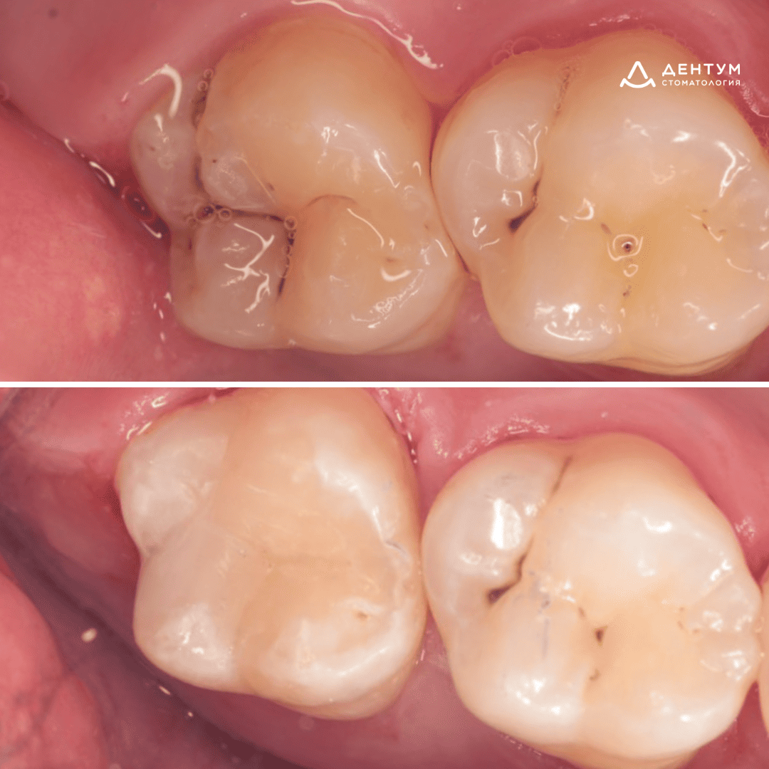 Пациент обратился на осмотр, в ходе которого были выявлены кариозные поражения жевательных зубов. На поверхности зубов присутствовали кариозные полости и пигментированные участки в фиссурах.